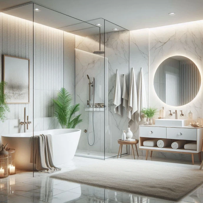 Full bathroom renovation including waterproofing, tile fitting, sanitary installation, shower area, and complete plumbing work for a fresh modern bathroom.